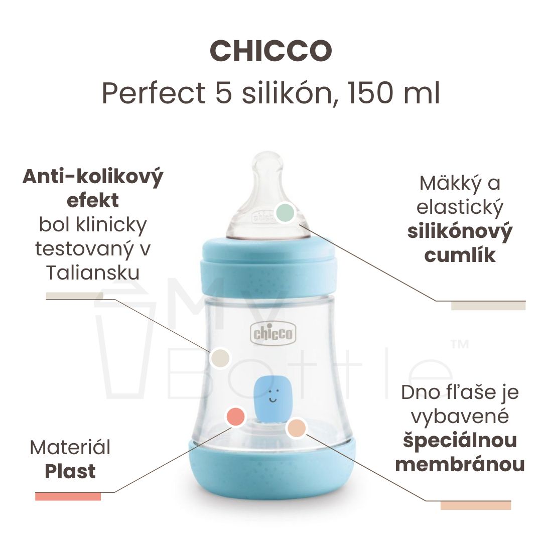 Chicco plastová dojčenská fľaša Perfect 5 je vhodná pre deti od 0m+ a má pomalý prietok.