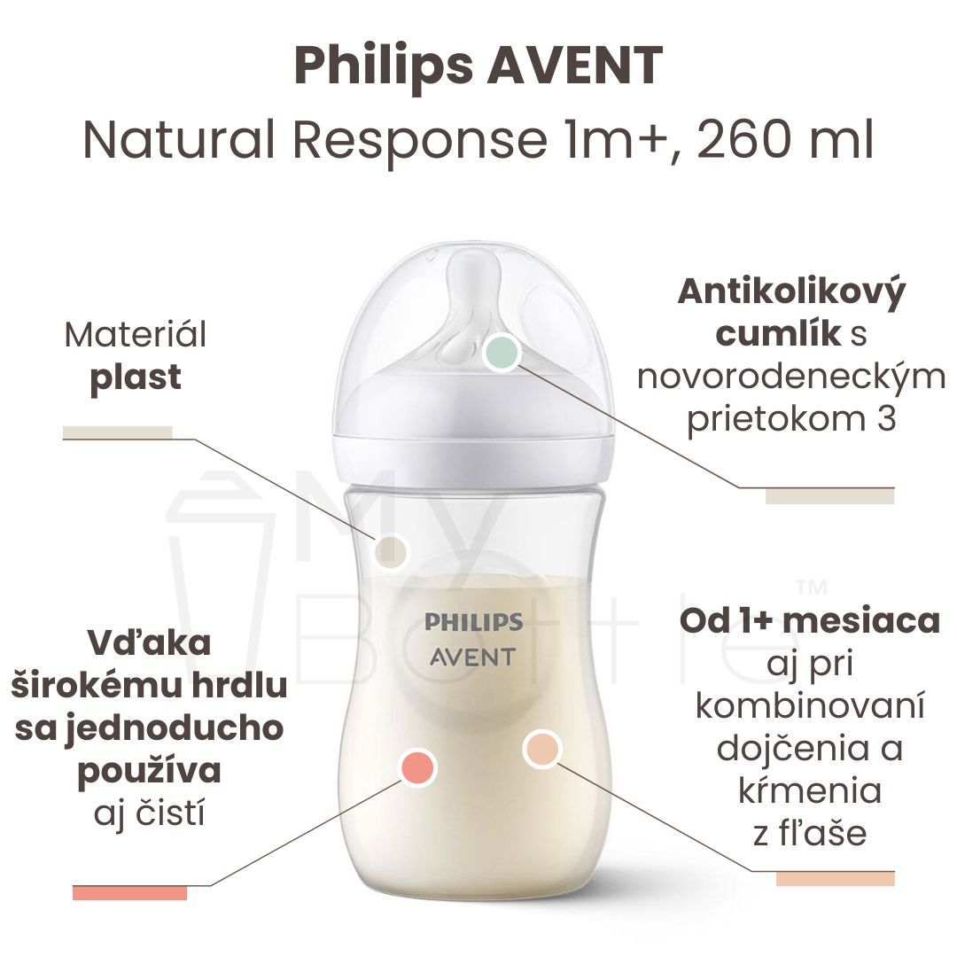 Táto dojčenská fľaša je vhodná ak potrebujete kombinovať dojčenie s kŕmením bábätka z fľaše. Cumlík Natural Response fľaše je navrhnutý tak, aby pripomínal ženský prsník. Tým sa zabezpečí, že dieťa naďalej prirodzene pohybuje a zapája rovnaké svaly a jazyk ako pri dojčení, a tiež využíva sací reflex. Cumlík uvoľňuje mliečko len vtedy, keď dieťatko saje.
