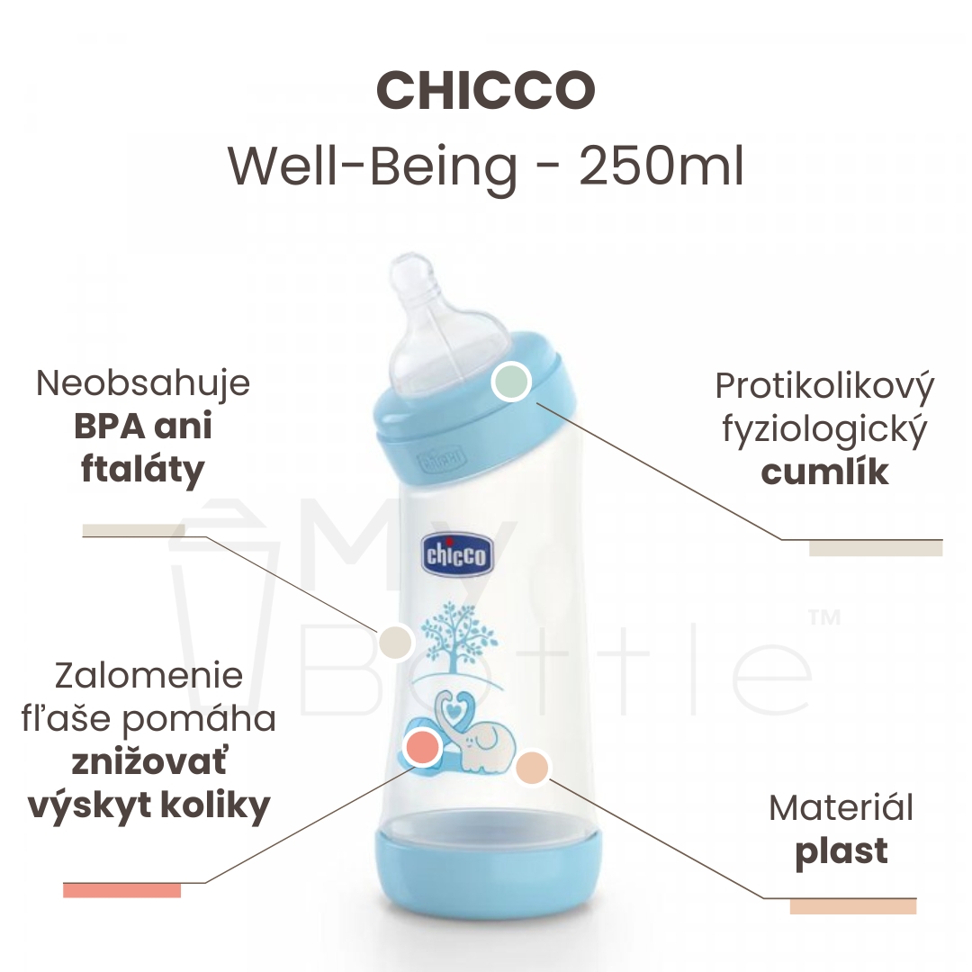 Dojčenská fľaša zahnutá bez BPA CHICCO Well-Being cumlík - modrá 250ml