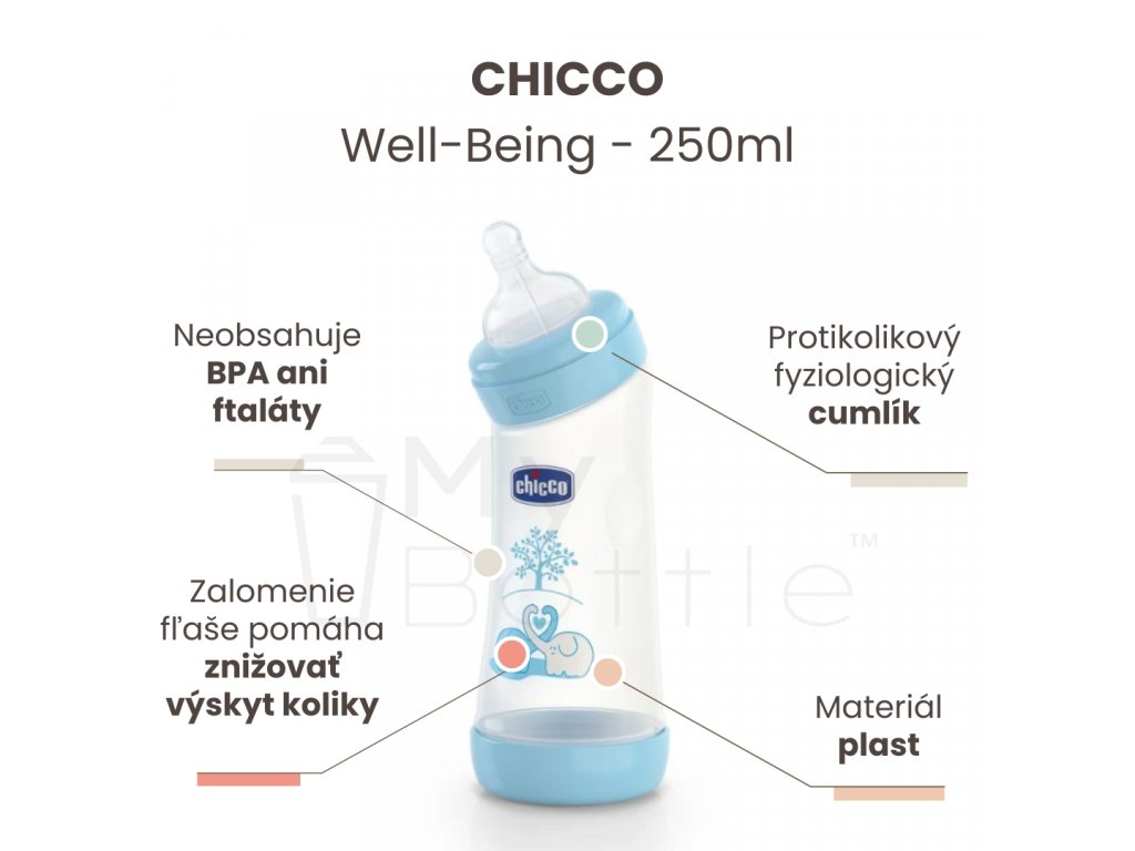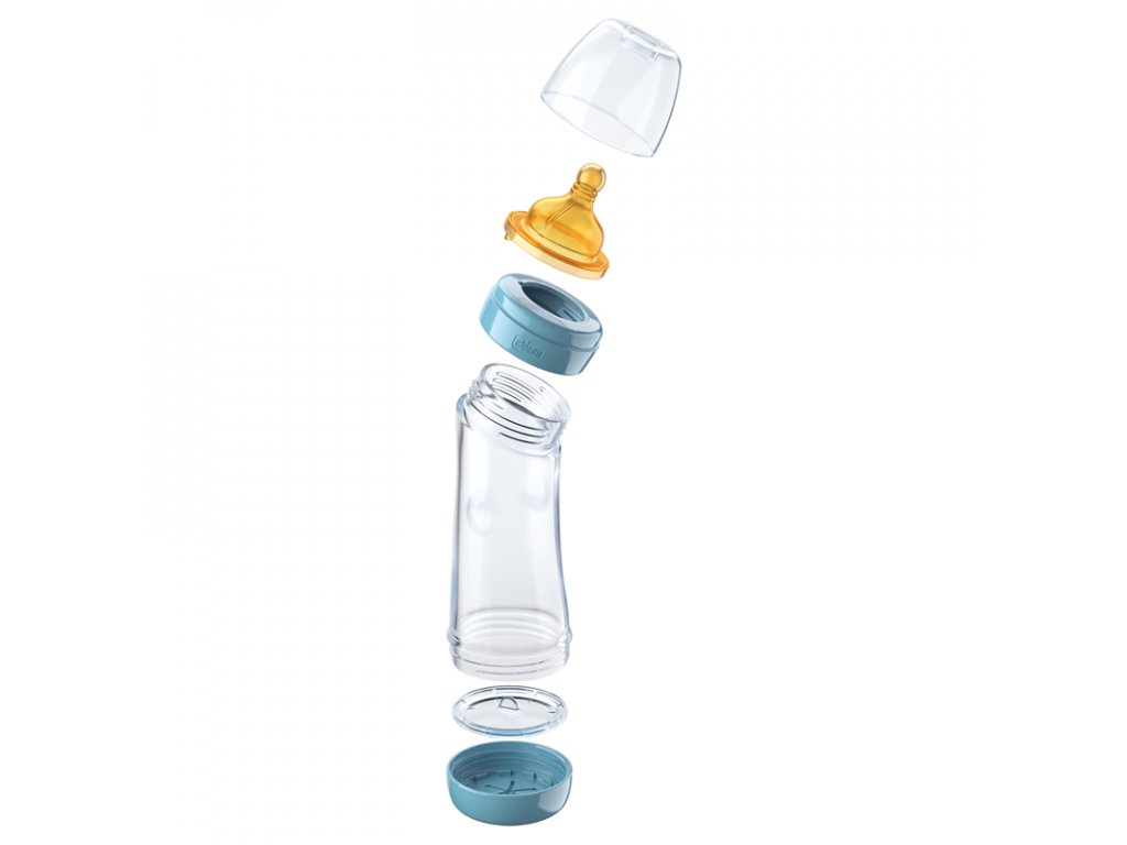 Dojčenská fľaša zahnutá bez BPA CHICCO Well-Being cumlík - modrá 250ml