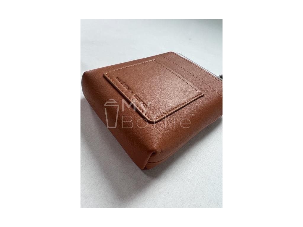 Kožený obal pre fľašu memobottle A6 má na jednej strane našité vrecko s dostatočným priestorom pre vaše doklady či platobnú kartu - Obal bol navrhnutý austrálskou luxusnou značkou Kinnon.