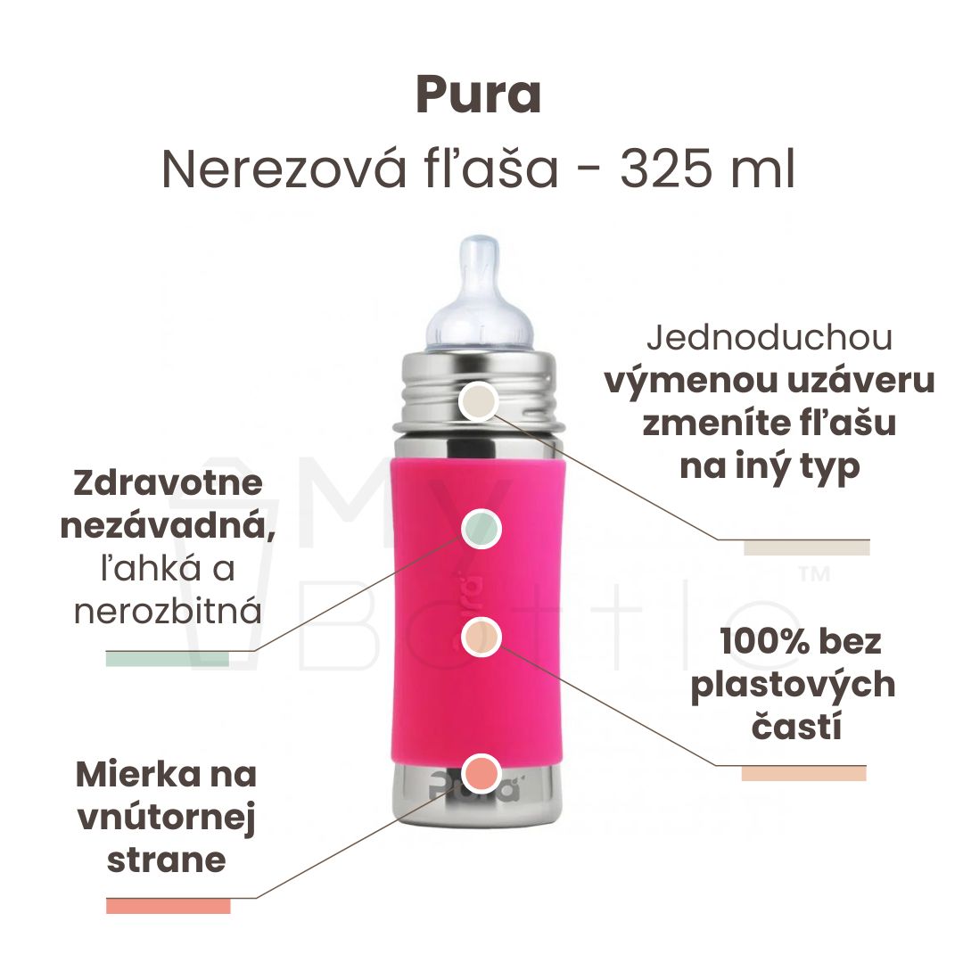 Balenie obsahuje: nerezovú fľašu 325ml, nerezovú objímku, antikolikový cumlík Pura Natural Vent Nipple™ (stredný prietok), silikónový návlek - ružový, silikónový vrchnák.