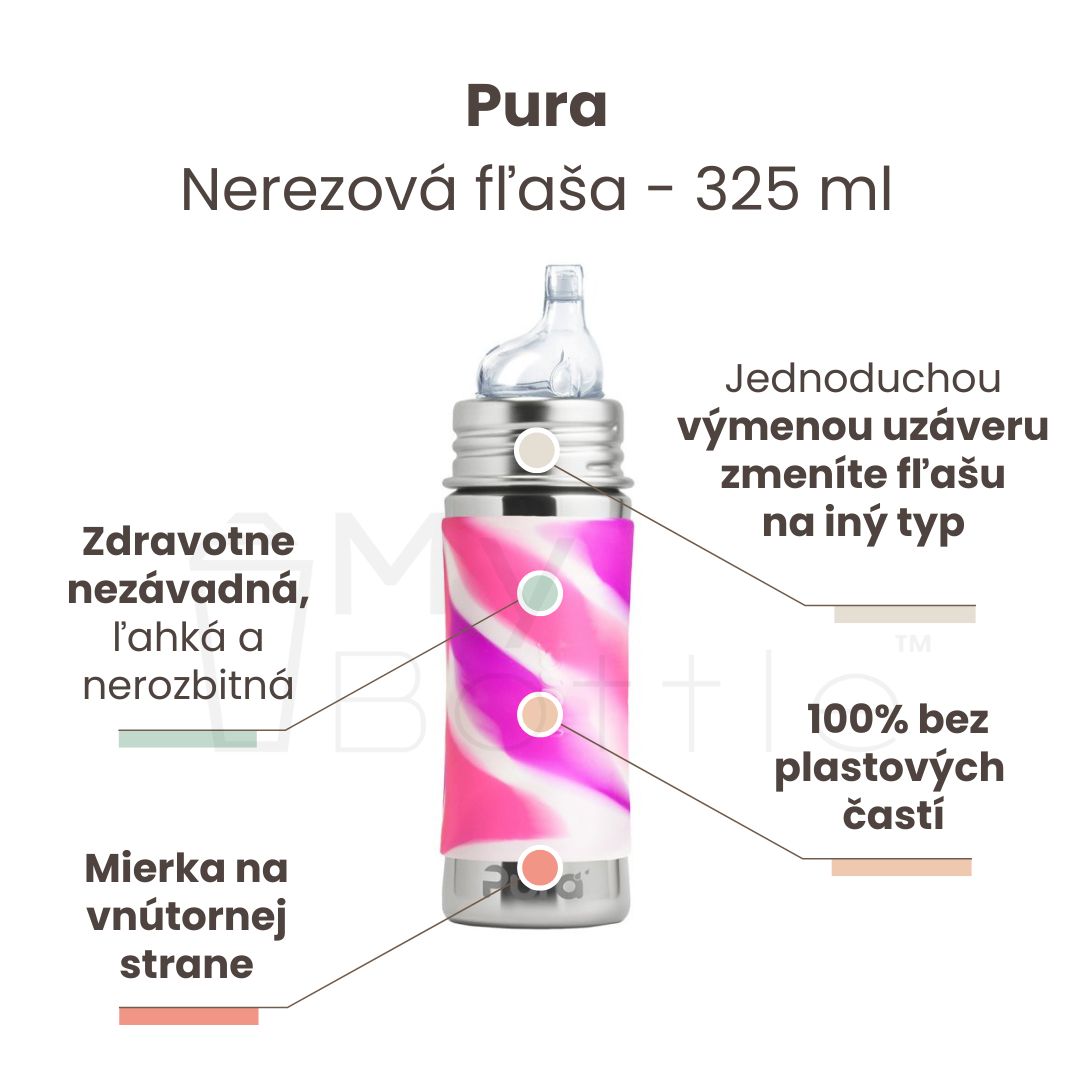 Balenie obsahuje: nerezovú fľašu 325 ml, nerezovú objímku, silikónový netečúci Pura náustok, silikónový návlek - ružovo/biely, silikónový vrchnák