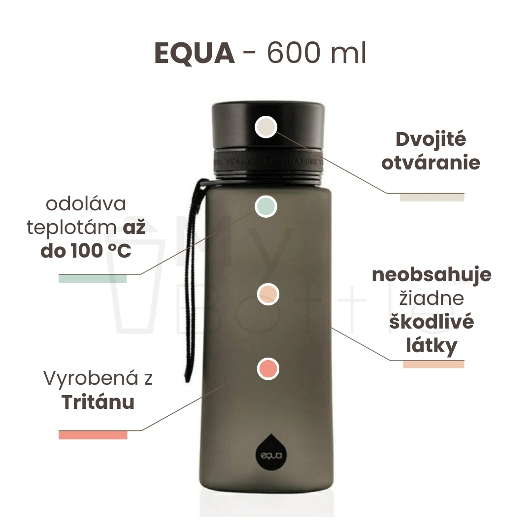 Zdravotne nezávadná fľaša EQUA je vyrobená z organických materiálov a neobsahuje žiadne škodlivé látky ako napríklad BPA, ktoré sa nachádzajú v niektorých plastoch.