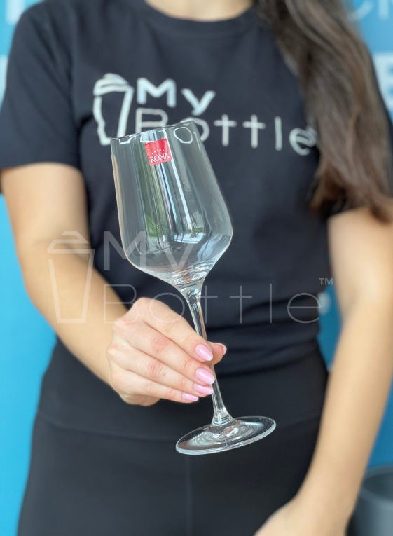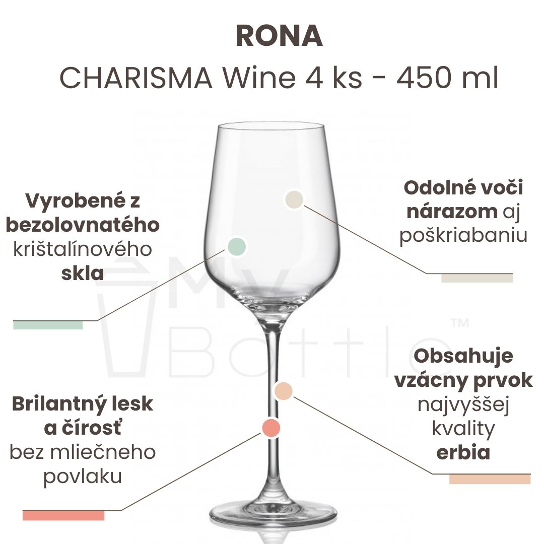 Pohár na víno RONA má objem 450 ml a je vyrobený z bezolovnatého krištalínového nápojového skla.