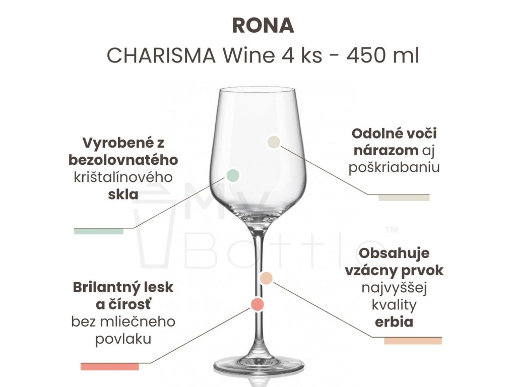 Pohár na víno RONA má objem 450 ml a je vyrobený z bezolovnatého krištalínového nápojového skla.