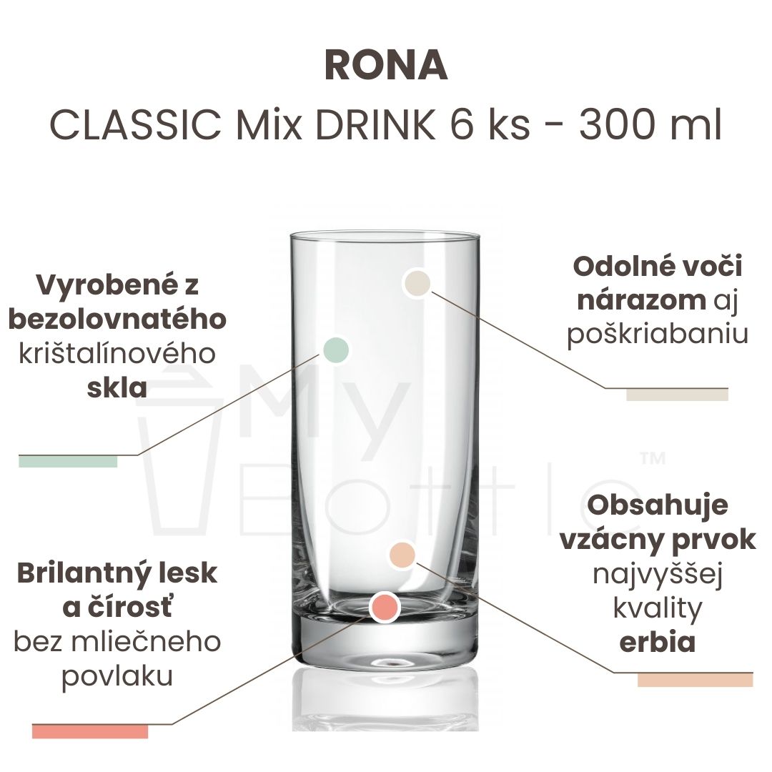 Značka Rona je jedným z najväčších a popredných výrobcov bezolovnatého krištalínového nápojového skla. Vďaka špičkovým technológiám výroby, materiálu a použitiu vzácneho prvku najvyššej kvality erbia majú produkty brilantný lesk a čírosť bez mliečneho povlaku.