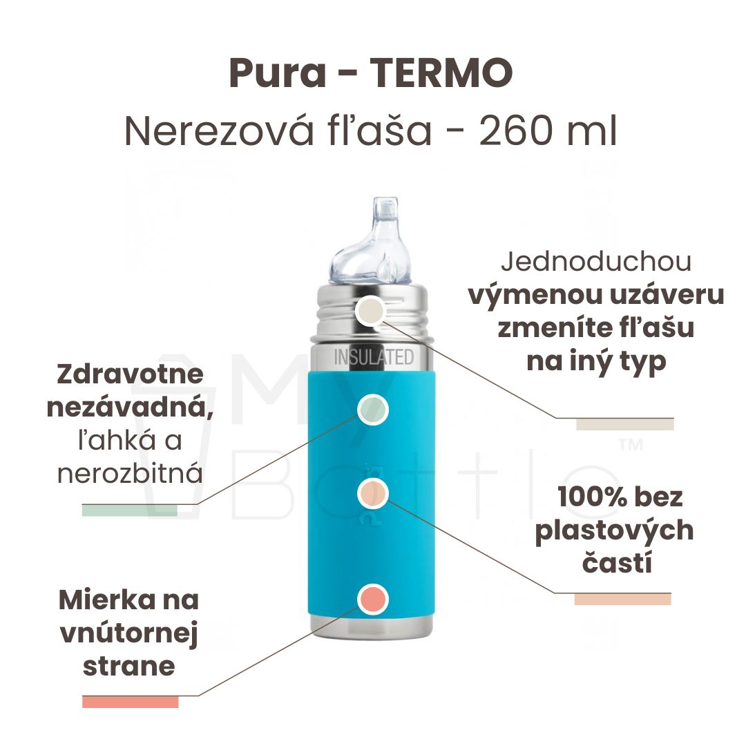 Výhodou nerezovej fľaše Pura je, že sa prispôsobuje a “rastie” s vašim dieťaťom. Jednoduchou výmenou viečka sa fľaša mení z dojčenskej fľaše s cumlíkom na fľašu s náustkom, slamkou alebo športovým uzáverom, alebo s použitím tesniaceho disku na pohárik na príkrmy a drobné občerstvenie. Jednu a tú istú fľašu, tak môžete používať mnoho rokov. Takto jednoducho šetrite nielen peniaze, ale pomáhate aj životnému prostrediu.