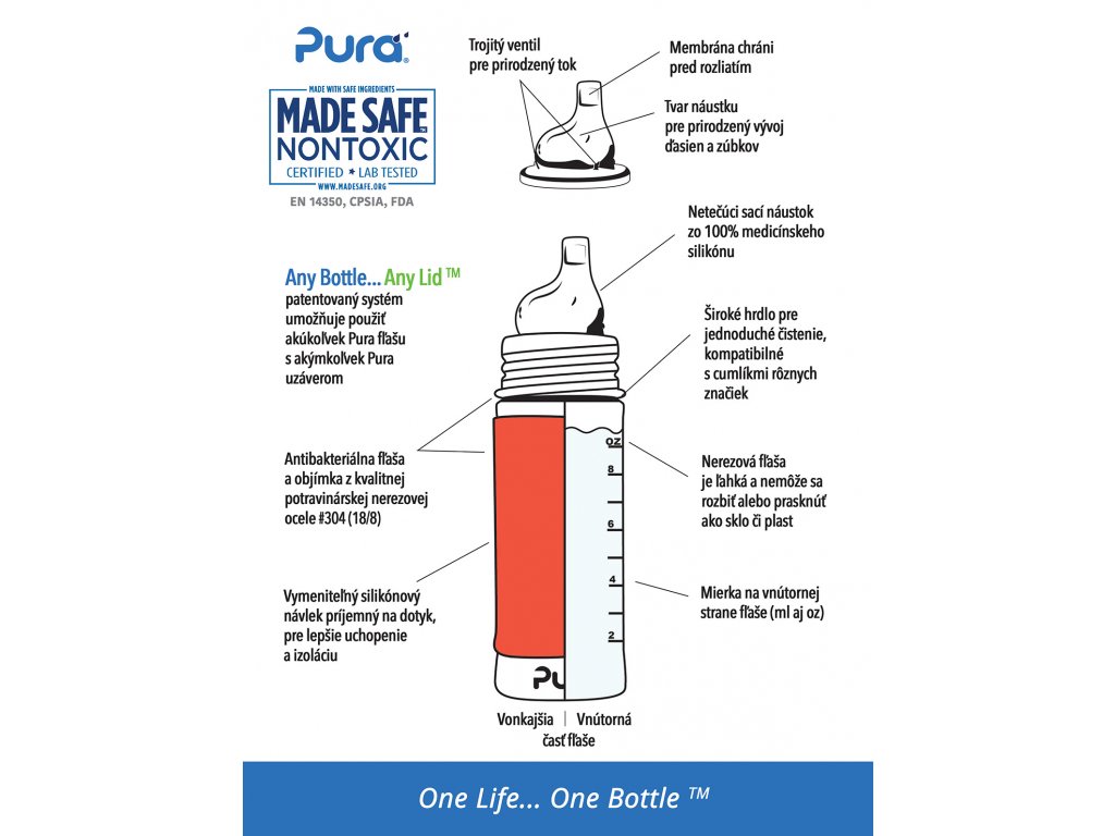 Bezpečná fľaša vyrobená 100% bez plastových častí. S Pura fľašami si môžete byť istí, že sa do nápoja vnútri neuvoľňujú žiadne škodlivé látky a toxíny, príchute či pachy ako je tomu priniektorých plastových fľašiach alebo fľašiach s plastovými vrchnákmi. Je jedinou fľašou, ktorá získala certifikát NonToxic Certified.