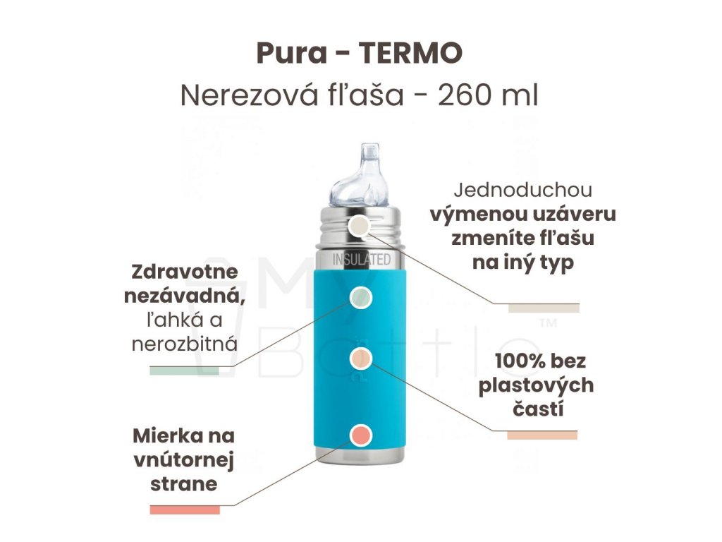 Výhodou nerezovej fľaše Pura je, že sa prispôsobuje a “rastie” s vašim dieťaťom. Jednoduchou výmenou viečka sa fľaša mení z dojčenskej fľaše s cumlíkom na fľašu s náustkom, slamkou alebo športovým uzáverom, alebo s použitím tesniaceho disku na pohárik na príkrmy a drobné občerstvenie. Jednu a tú istú fľašu, tak môžete používať mnoho rokov. Takto jednoducho šetrite nielen peniaze, ale pomáhate aj životnému prostrediu.