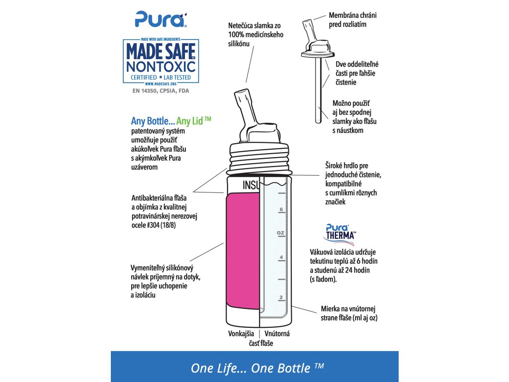 Silikónová slamka Pura má hrot s ventilom, ktorý zabraňuje rozliatiu. Slamka má odnímateľnú vnútornú trubicu a je dvojdielna, čo zabezpečuje jednoduché čistenie. Navyše z nej môžete piť dvoma spôsobmi vzpriamene ako cez klasickú slamku (s pripevnenou vnútornou trubicou slamky) alebo naklonením fľaše (s odstránenou vnútornou trubicou slamky).