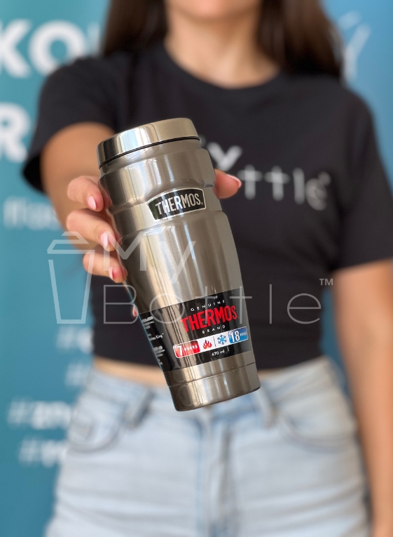 Prémiový termohrnček Thermos z nehrdzavejúcej ocele s dvojitou stenou.