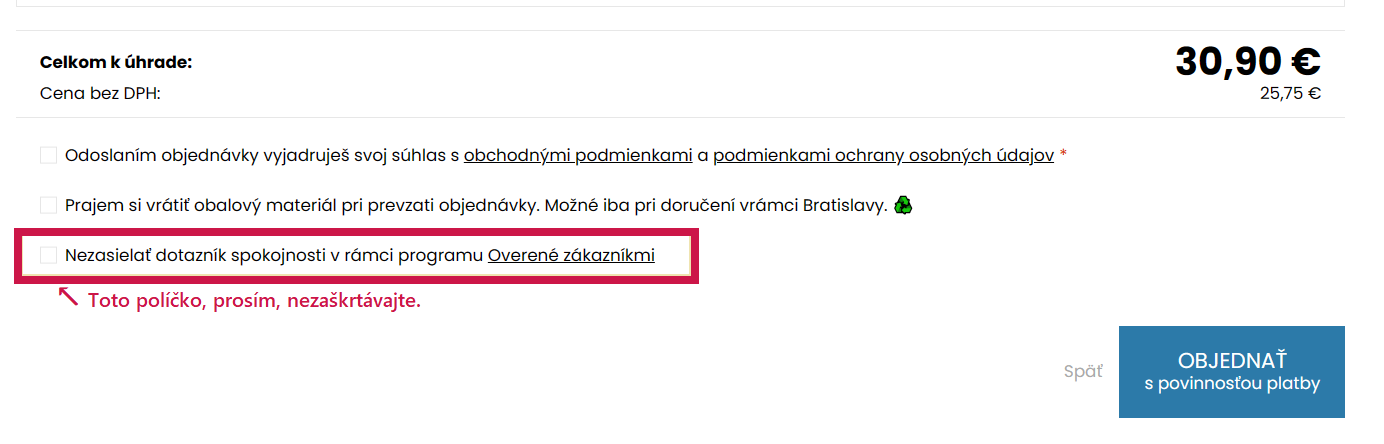 (Je dôležité, aby ste pri poslednom kroku objednávky NEZAŠKRTLI možnosť "Nezasielať dotazník spokojnosti v rámci programu Overené zákazníkmi.".